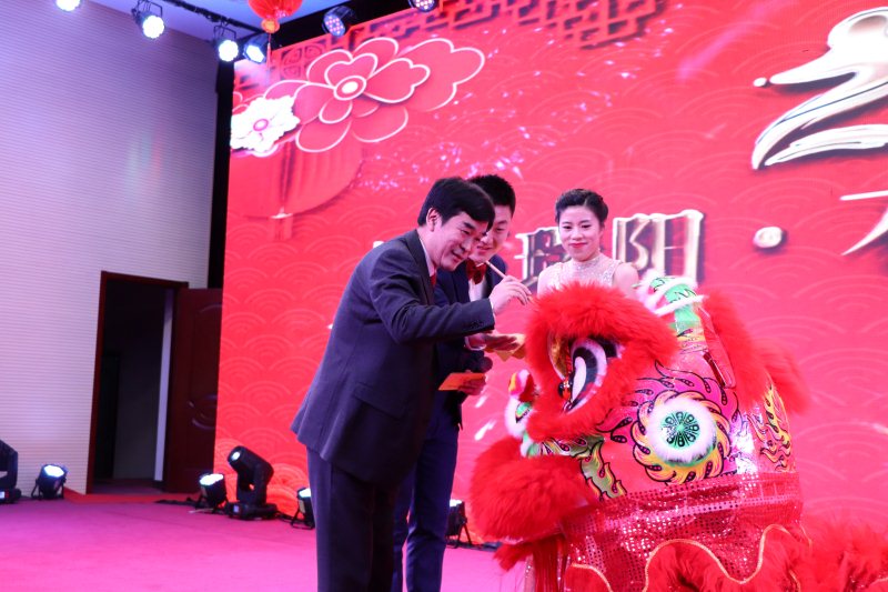 輾轉騰挪雄獅舞財運,翻飛跳躍新春送祥瑞。在苗董為雄獅點睛之后,一頭充滿活力的紅色雄獅在舞臺上騰挪跳躍,寓意著瑞陽一枝獨秀,配合著大屏幕不斷轉換的場景,粉針事業部張希鵬、尹玉亮為大家奉上了華麗壯觀、惟妙惟肖的演出《雄獅助興》